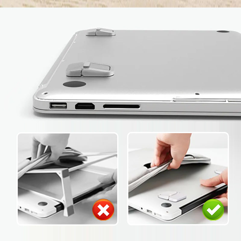 Spårlöst häftämne - Laptopstativet har ett spårlöst häftämne som ger stark vidhäftning och stabilt stöd, utan att lämna några rester när det demonteras. För ökad stabilitet medföljer två bitar halkskyddssilikon som kan fästas på undersidan av den bärbara datorn, vilket fördubblar halkskyddseffekten och ger ett extra lager av säkerhet.